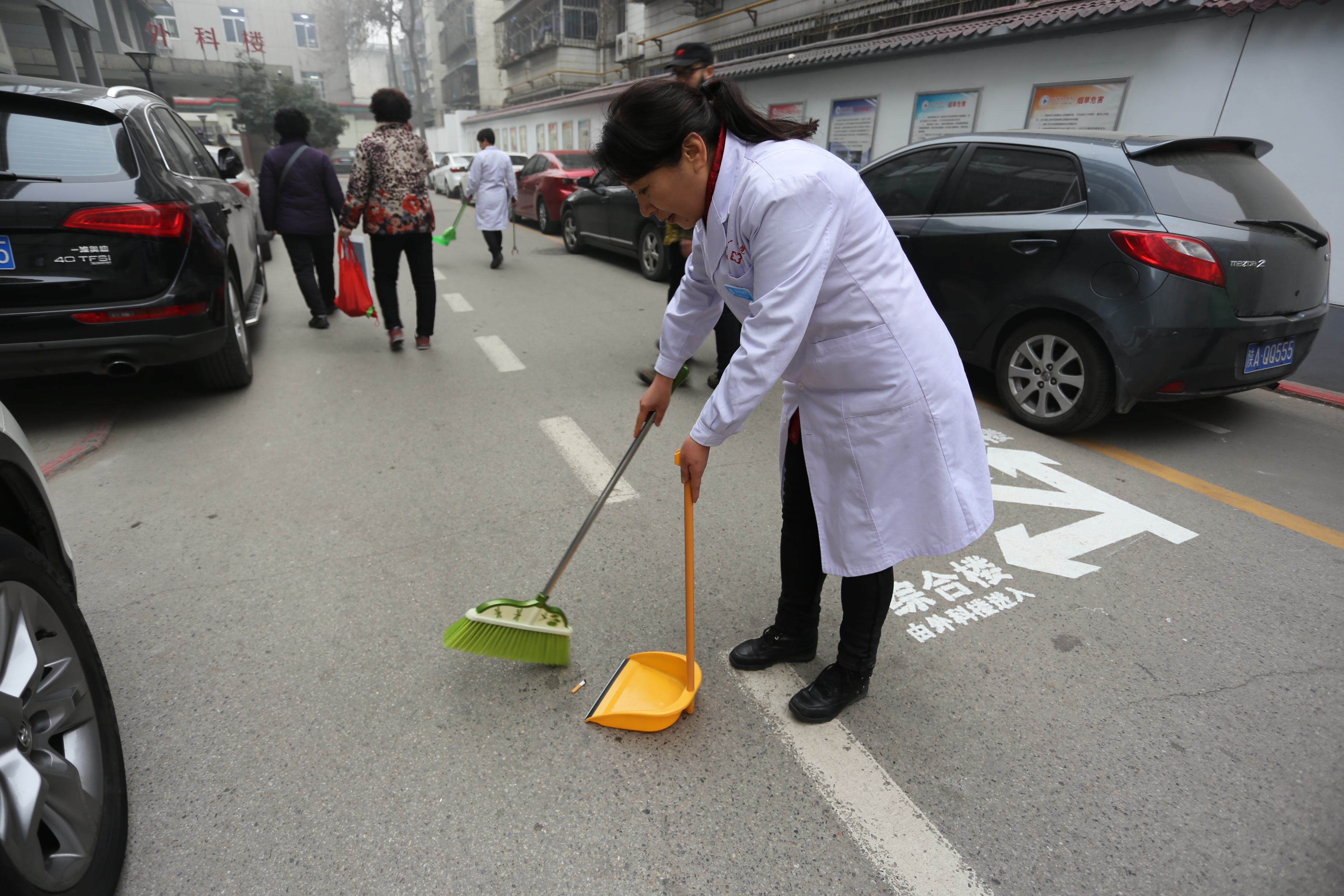 仪式结束后,控烟代表、保洁员代表和青年志愿者分组前往院内外划分区域捡拾烟头,并对吸烟者进行劝阻,指引前往指定吸烟区吸烟。