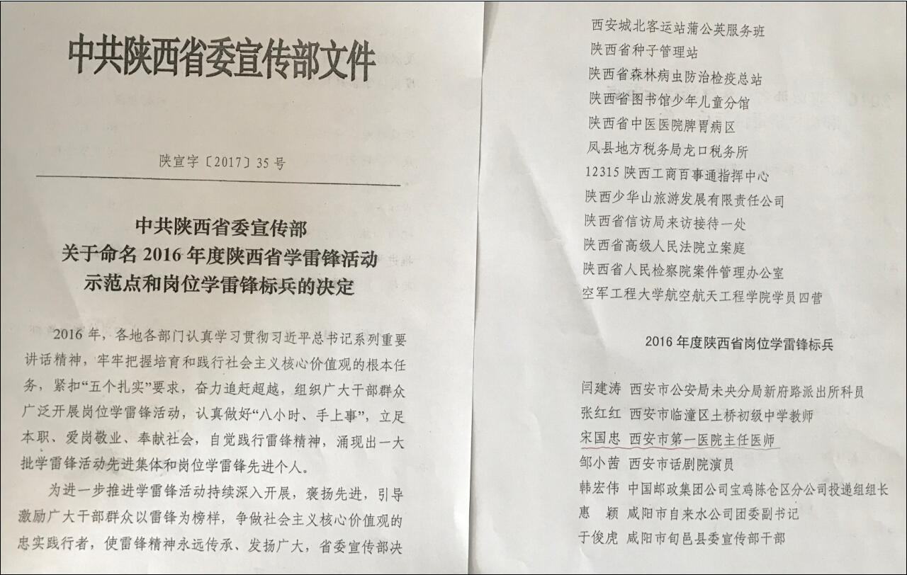 宋国忠同志荣获陕西省岗位学雷锋标兵荣誉称号