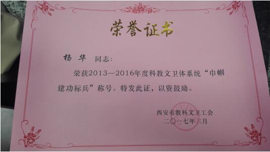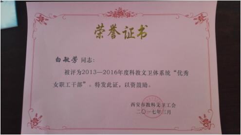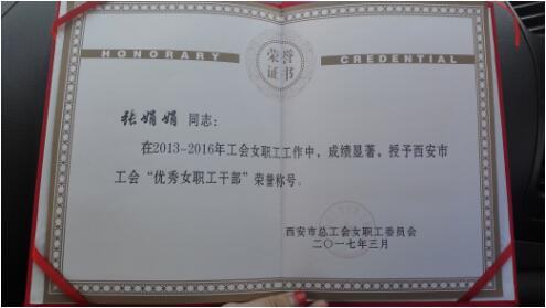 护理部主任、女工委主任张娟娟荣获西安市工会“优秀女职工干部”荣誉称号。