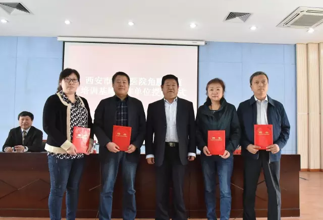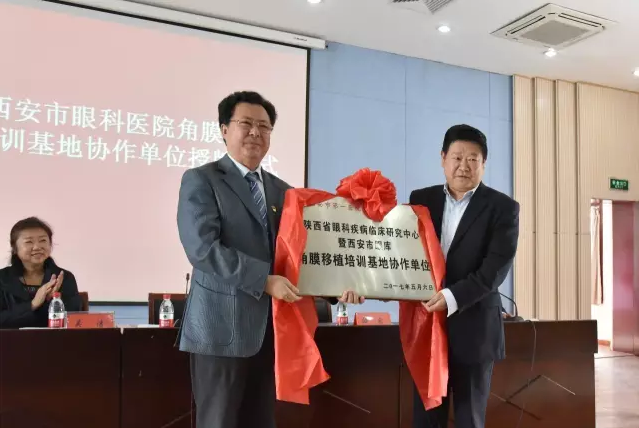 院长张世明与黄河医院院长骆宾代表双方在合作协议上签字,并共同为角膜移植培训基地协作单位揭牌;黄河医院院长骆宾为西安眼科医院的专家组成员颁发了聘书。