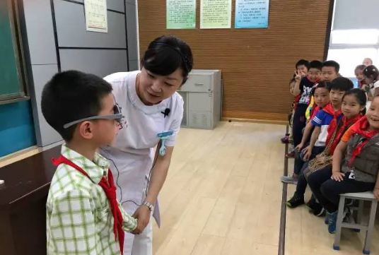 激光近视治疗中心护士长赵艳担任主讲人,走进校园,来到一年级小朋友们身边,用通俗诙谐的语言和严谨的医疗态度告诉他们——近视是如何形成的,我们该怎么做才能远离近视眼。