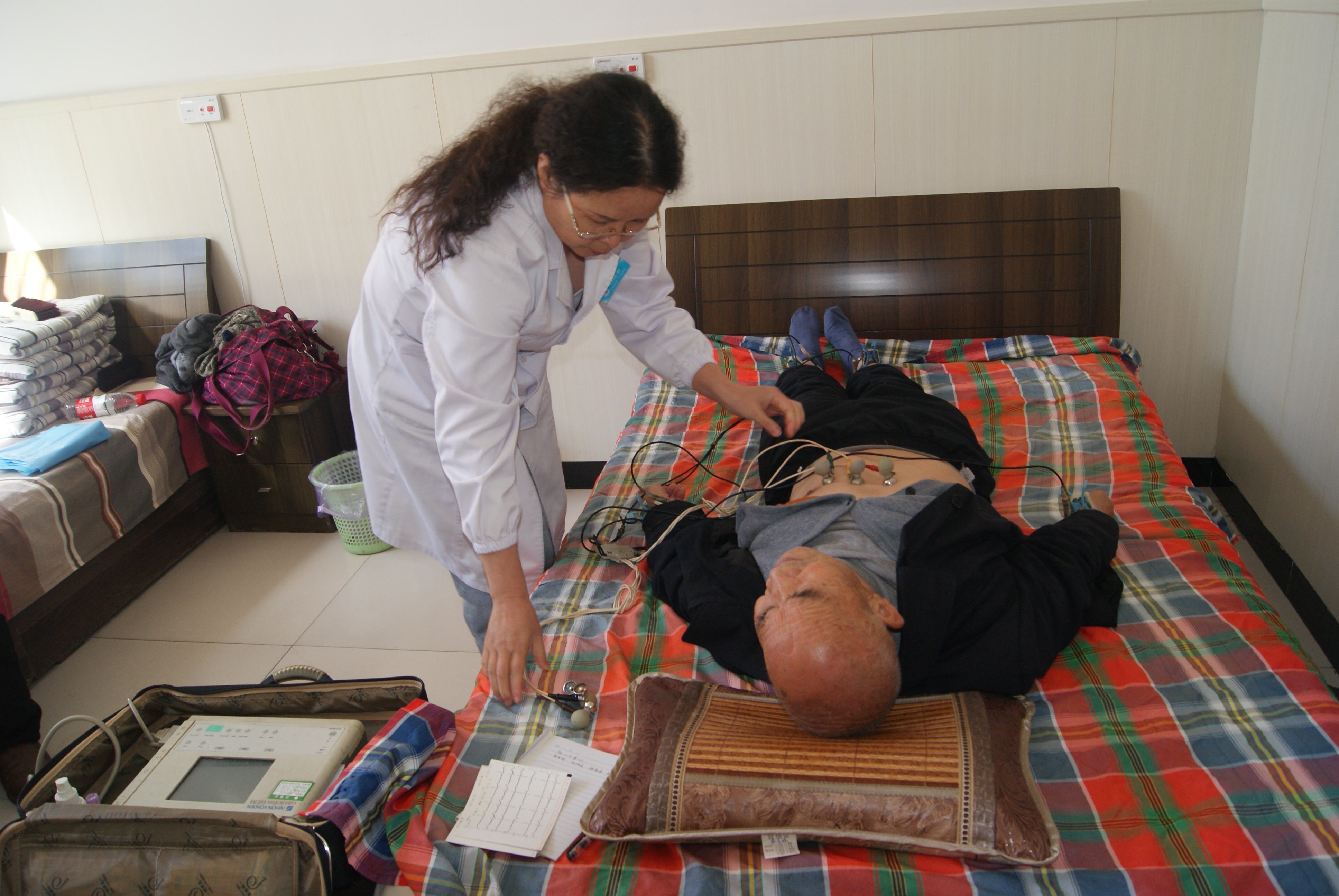 此次义诊接诊老人70人次,检测血糖50人次,测量血压60余人次,心电图检查40余人次,裂隙灯检查50余人次,眼底镜检查20余人次。