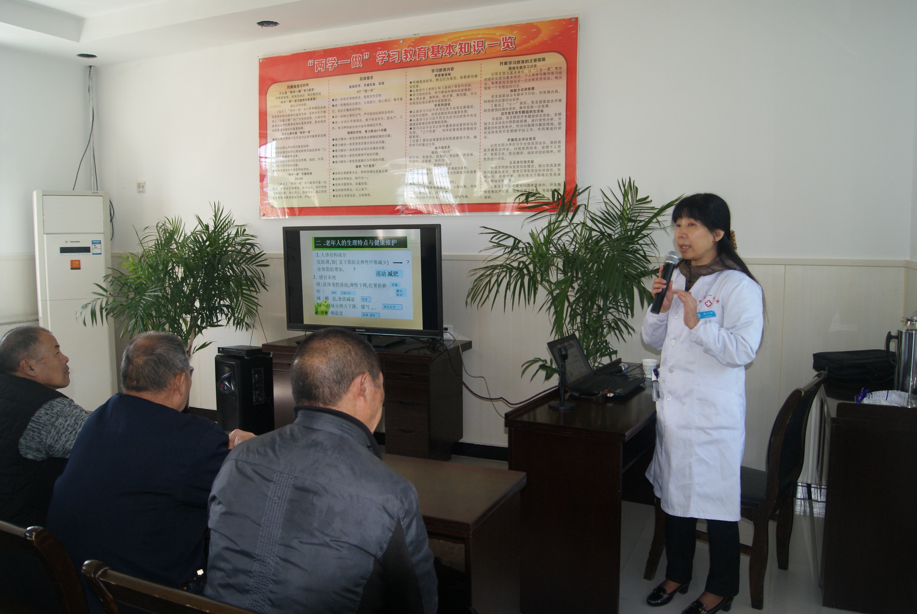 门诊一支部组成的体检团队很快布置仪器设备,开展义诊活动。雷晓航主任对老人进行了《老年人健康知识讲座》,医疗人员进行血压测量、血糖监测、裂隙灯检查、心电图检查等。