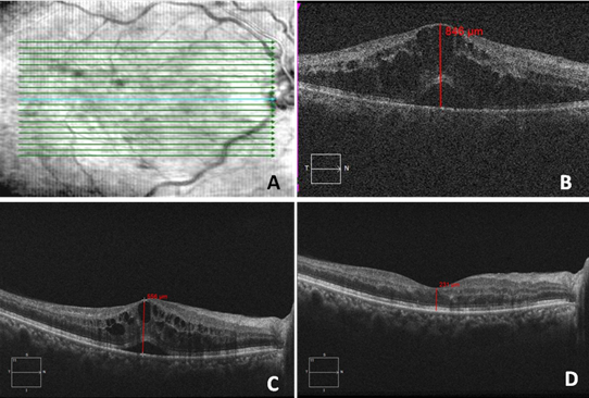 陆慧琴主任诊断为右眼视网膜中央静脉阻塞并黄斑水肿(图A),向患者详细交代病情及目前可采取的两种治疗方法的利弊--抗新生血管药物和ozurdex后,患者决定自愿接受ozurdex治疗,于2018年02月13日在局部麻醉下成功为这位患者植入傲迪适(地塞米松玻璃体内植入剂),这是傲迪适在中国上市以来,西北地区首例成功植入傲迪适治疗CRVO的手术。手术由陆慧琴主任操作完成。患者右眼术前视力0.2,眼内压15mmHg,CRT为846um(图B);术后第一天视力0.4,眼内压13mmHg, CRT降556um(图C);术后第九天视力0.5,眼内压14mmHg,CRT降至231um,黄斑水肿完全消失(图D)。术后眼部炎症反应轻、未见明显结膜下充血。