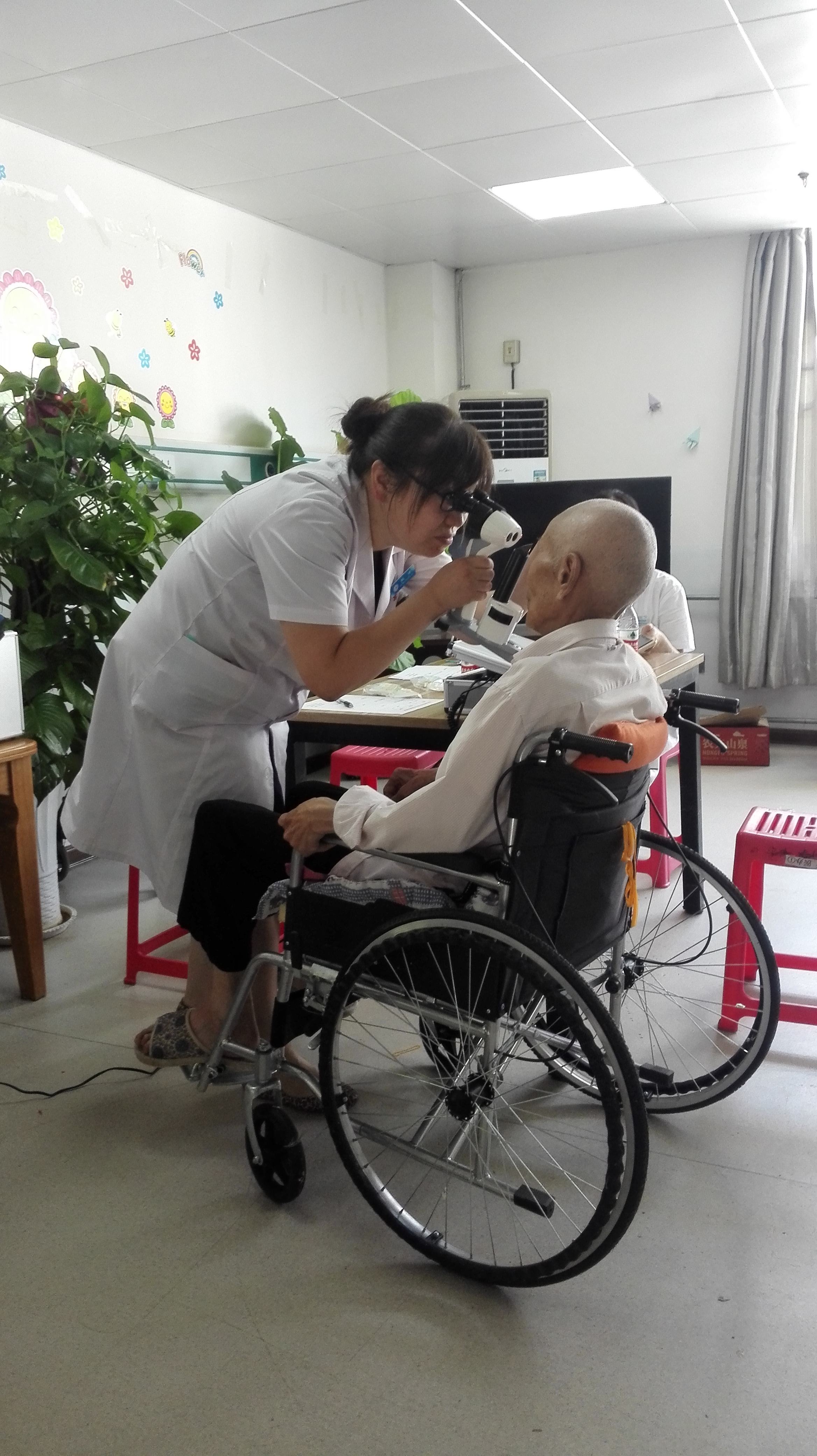 眼库吕沛霖主任医师组成医疗队进行义诊活动。护理院的住院病人平均年龄在75岁左右,且大部分是行动不便的失能患者。面对这些特殊的高龄患者,医疗队制定了检查流程,在护理院护工的配合下对每一位患者进行了详细的眼科检查,并出具了检查报告。对于卧床不起的患者,则走到床前进行检查。经过3个小时的工作,医疗队共检查病人81人,并将检查结果和处理意见反馈给护理院,以便进行后续的治疗工作。