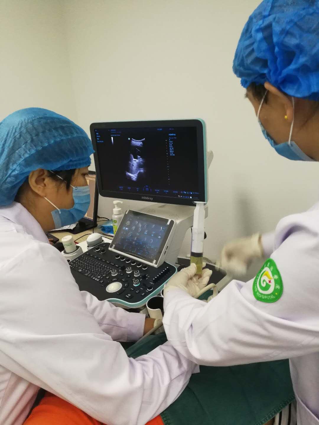 超声科主任展小军与对口支援医生杨艳秋的紧密配合下,短短30分钟,通过一根穿刺针,直径近7cm的肝囊肿就被完全抽吸硬化完毕,患者生命体征平稳,休息几小时后已活动自如。