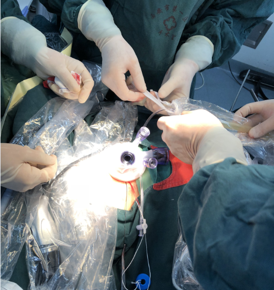 2018年10月29日由宋迎春主任主刀,黄喜英医师为第一助手,屈丹医生为第二助手,为患者在全麻下行单孔腹腔镜探查术,术中见患者盆腔粘连严重,双侧输卵管迂曲不通,与盆壁粘连。因患者术前输卵管造影提示右侧输卵管峡部不通,遂决定行单孔腹腔镜下双侧输卵管修复整形术、盆腔粘连松解术及宫腔镜下输卵管插管疏通术。经过宋主任耐心细致的手术,恢复其输卵管正常走行,且通液后见双侧输卵管有亚甲蓝液顺利流出。