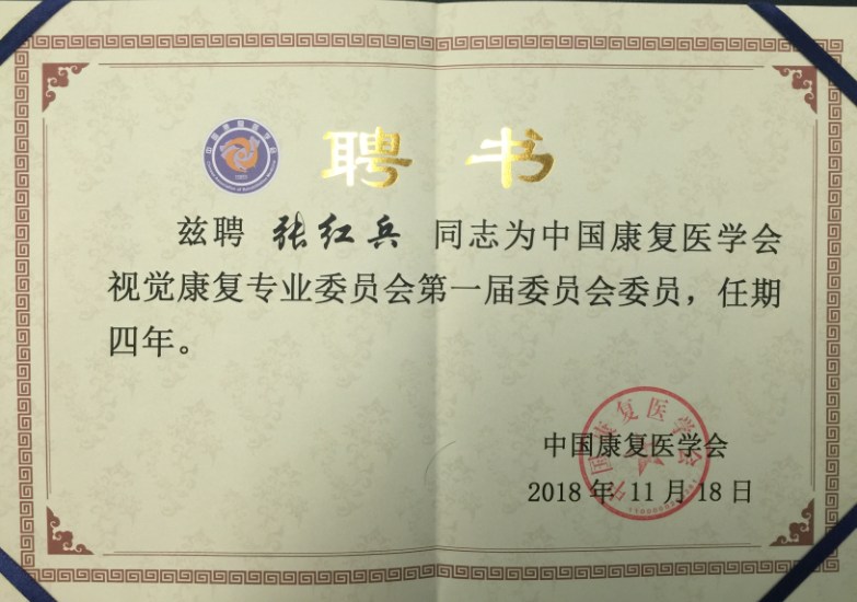 眼科医院张红兵副院长荣获中国康复 医学会视觉康复专业委员会委员资格