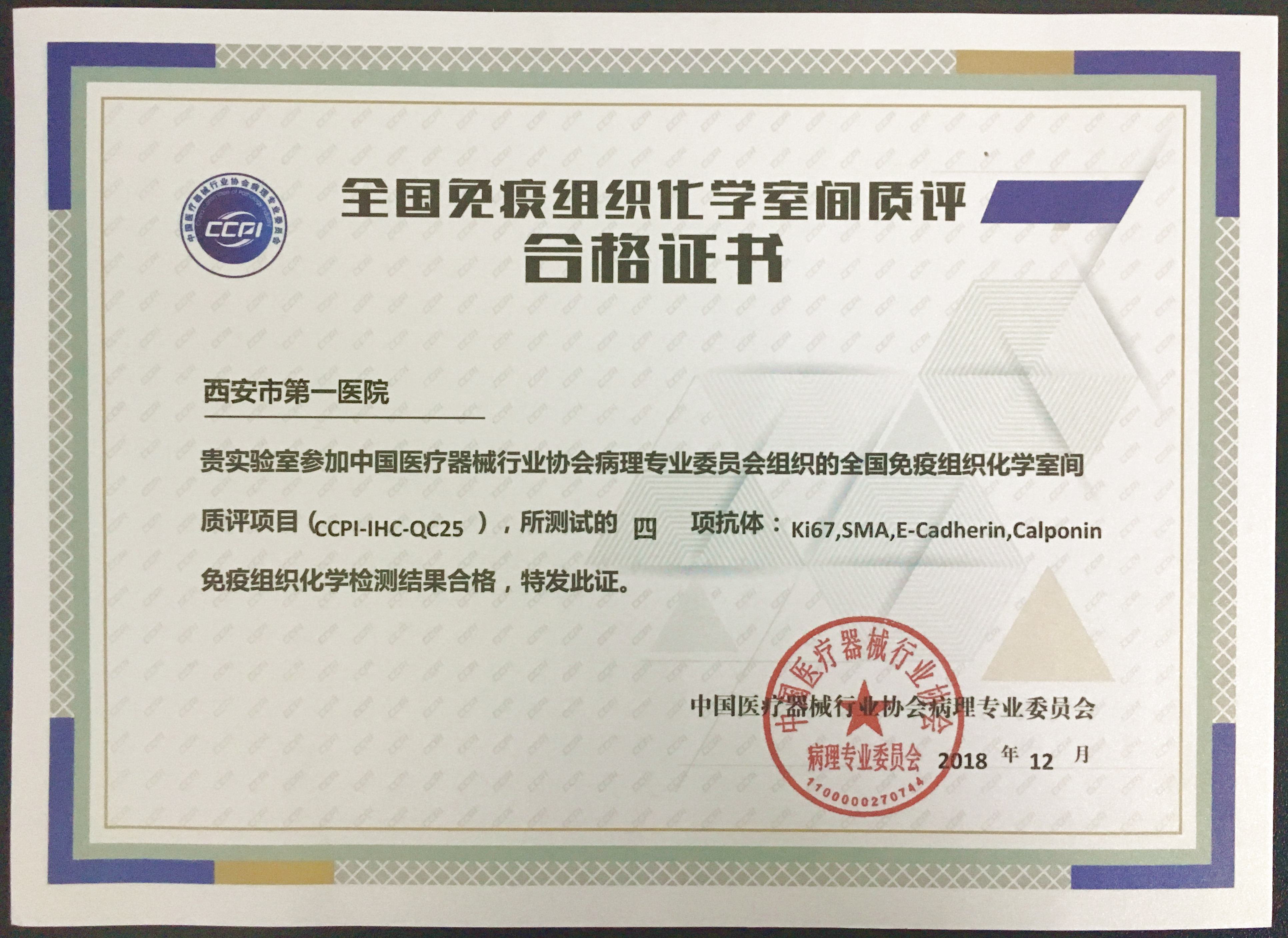 病理科接收到了来自中国医疗器械行业协会病理专业委员会颁发的全国免疫组织化学室间质评合格证书。