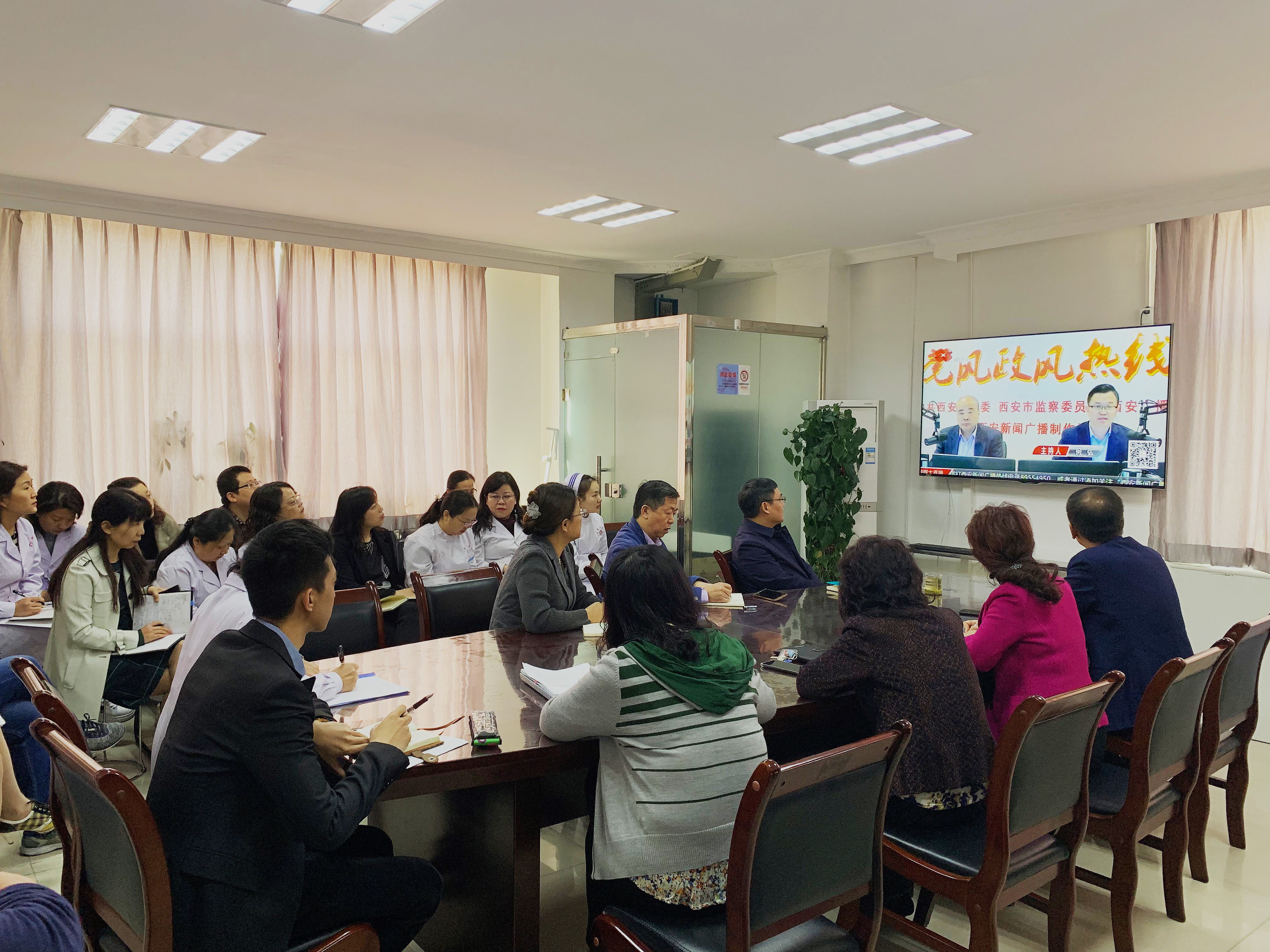 全体班子成员、行政职能部门中层干部在科协四楼会议室集中观看《党风政风热线》栏目,临床一线人员在科室进行观看。