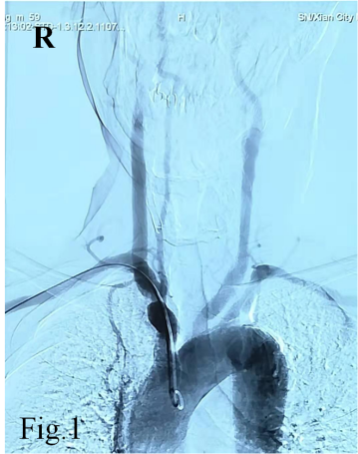 神经内科,双侧颈部血管、锁骨上窝均可闻及血管杂音,为详细评估脑血管情况,拟行全脑血管造影检查。常规的脑血管造影检查首选右侧股动脉穿刺入路完成造影,但是该患者存在明确的右下肢间歇性跛行病史,双侧股动脉搏动触摸不到。下肢动脉超声提示双侧股动脉中度狭窄,股动脉、腘动脉等下肢血管动脉粥样硬化斑块形成。仔细评估后,考虑无法从股动脉穿刺进行造影检查。经神经介入医生周密准备,拟进行经右侧桡动脉穿刺完成脑血管造影及下肢血管造影检查。