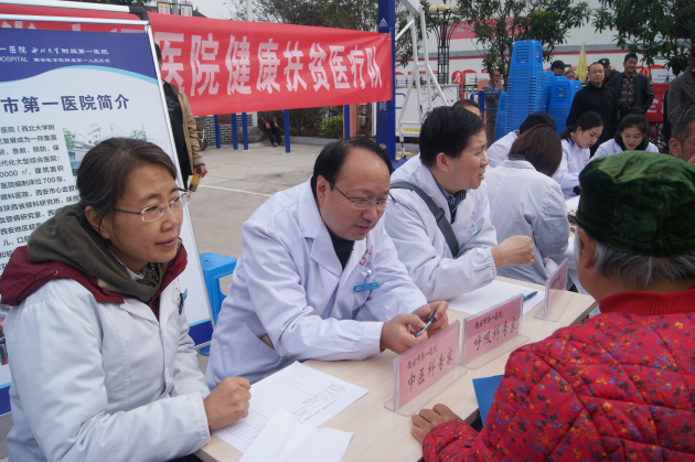 王克平副院长带队,医务科职瑾副科长、老年消化科刘永国主任、老年呼吸科赵昆主任、中医科刘玫主任、眼科韦伟主任等共计13余人,前往秦渡街办裴家寨村委会开展健康扶贫义诊工作。