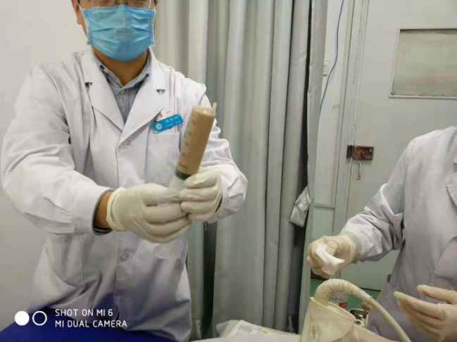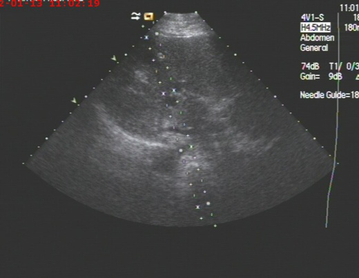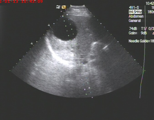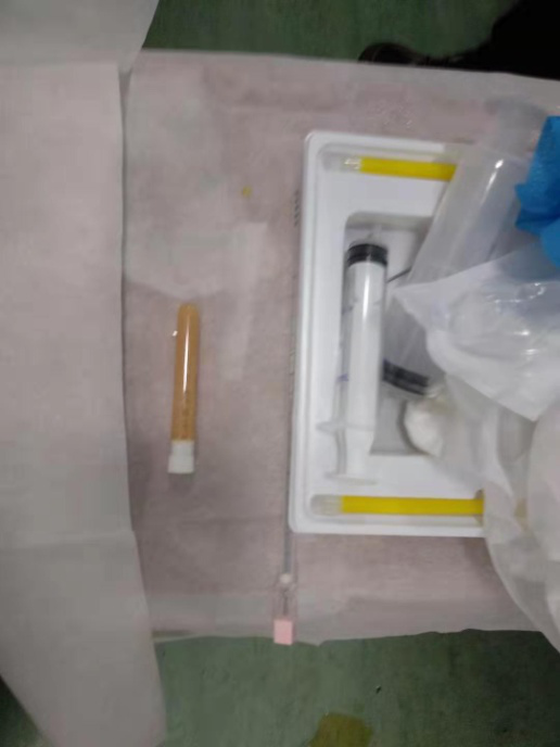 2019年10月呼吸科收治一男性、83岁高龄肺炎合并巨大肝脓肿患者,病人高烧不退,各项感染指标超高,病人既往是多囊肝病人,于10月17日进行超声引导下巨大肝脓肿抽吸治疗术。超声检查局部肝脓肿测量内经达:14cm,术中抽吸灰白色脓液800ml,并送培养,经一个多小时抽吸注药,直至抽出液体清亮,脓肿完全缩小,当即病人病情缓解,高烧消退。送检后显示感染细菌为克雷白氏杆菌,一周后原脓肿再次穿刺治疗,抽出囊液400ml,再次冲洗治疗,经培养已无细菌,随后痊愈出院。
