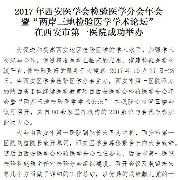 2017年西安医学会检验医学分会年会暨“两岸三地检验医学学术论坛”在第一医院成功举办