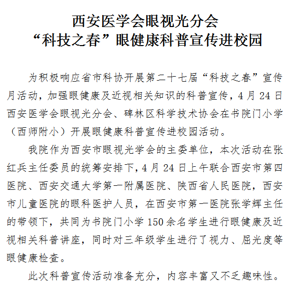 西安医学会眼视光分会“科技之春”,眼健康科普宣传进校园