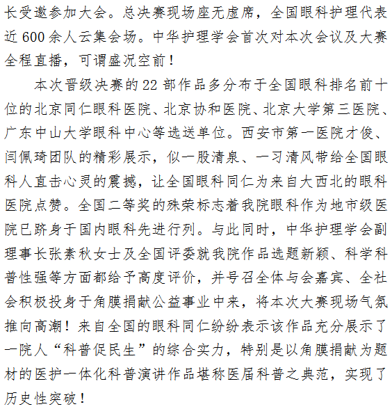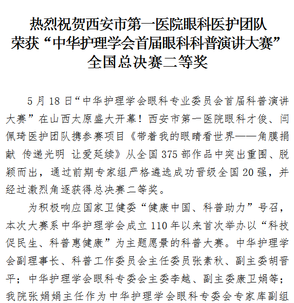 祝贺市一院眼科医护团队荣获“中华护理学会首届眼科科普演讲大赛”全国总决赛二等奖