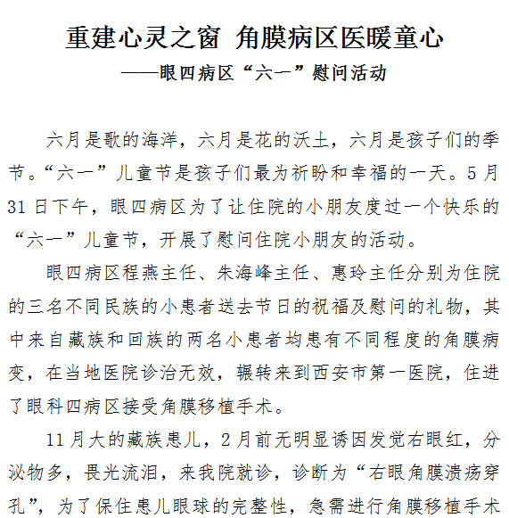 重建心灵之窗 角膜病区医暖童心——眼四病区“六一”慰问活动