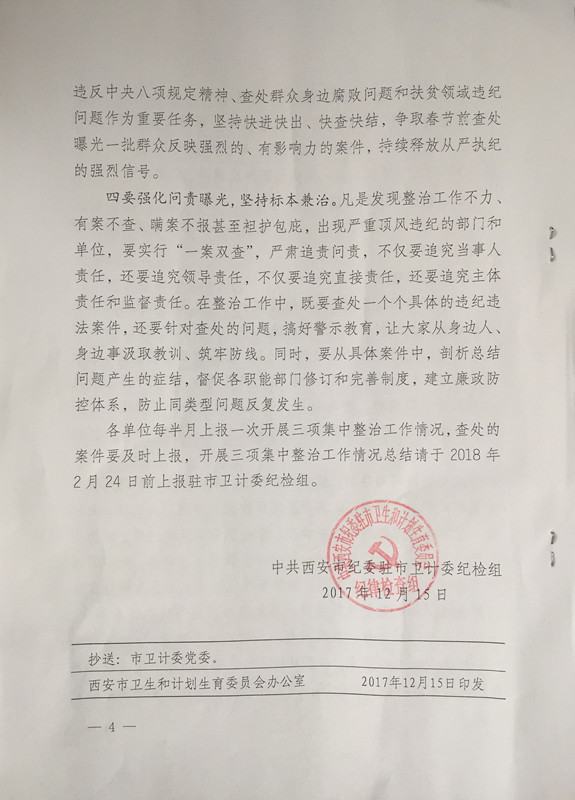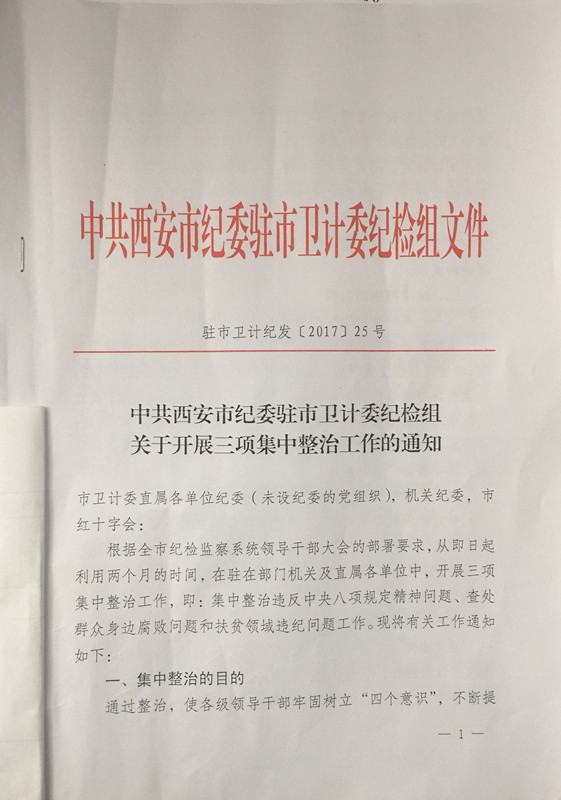 中共西安市纪委驻市卫计委纪检组关于开展三项集中整治工作的通知