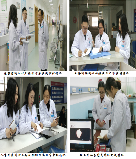 巡查中人事科根据各科的排班表随机抽查工作人员在职到岗情况,对点名未到人员进行实时联系说明外出原因,强调各科要严格落实《职工临时外出登记制度》,提醒职工平时加强纪律建设,科室负责人要做好日常考勤的监管。医务科对《九不准》内容进行现场提问,并查阅各科对于《九不准》情况落实的相关记录。政工科查看各科近期会议记录,查看科室落实上级安排的工作,是否存在有令不行,有禁不止问题,随后还抽查了个别党员《十九大报告》和《中国共产党章程》抄写完成情况。护理部则对各病区环境卫生及亲属探视秩序情况进行了实地查看。