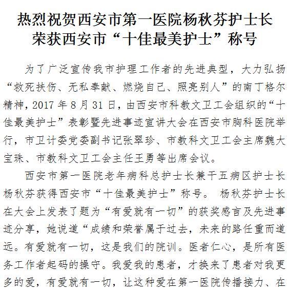 热烈祝贺21点游戏攻略站 杨秋芬护士长荣获西安市“十佳最美护士”称号
