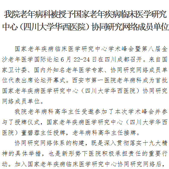 院老年病科被授予国家老年疾病临床医学研究中心(四川大学华西医院)协同研究网络成员