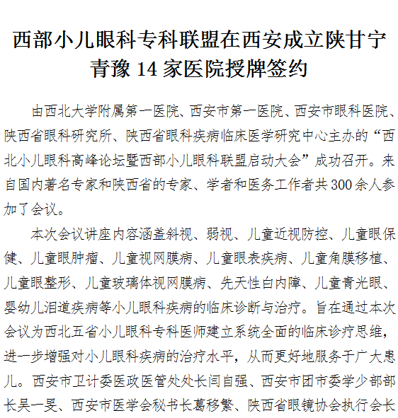 西部小儿眼科专科联盟在西安成立陕甘宁青豫14家医院授牌签约