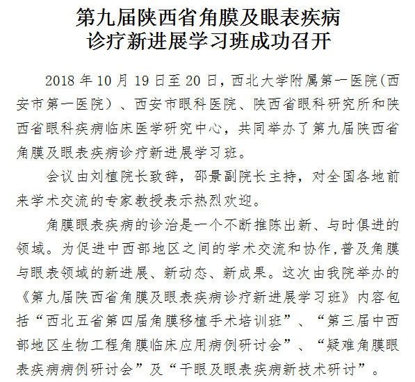 第九届陕西省角膜及眼表疾病 诊疗新进展学习班成功召开