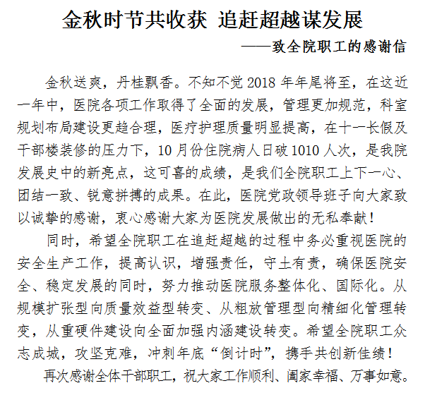 金秋时节共收获 追赶超越谋发展 ——致全院职工的感谢信