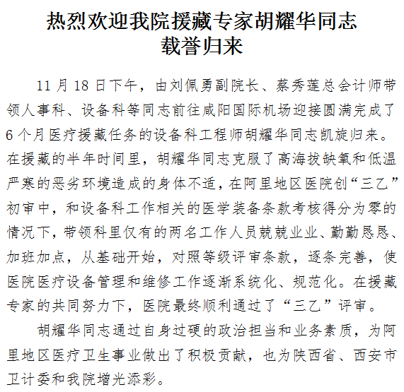 热烈欢迎21点游戏攻略站 援藏专家胡耀华同志载誉归来