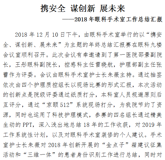 携安全 谋创新 展未来——2018年眼科手术室工作总结汇报