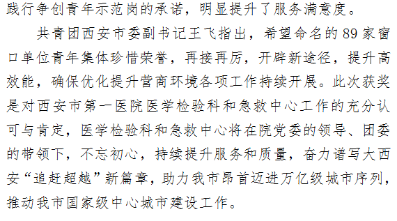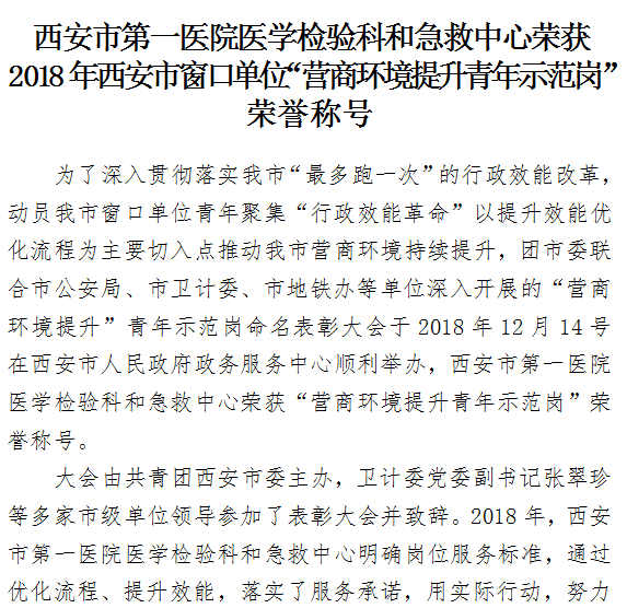 医学检验科和急救中心荣获2018年西安市窗口单位“营商环境提升青年示范岗”荣誉称号