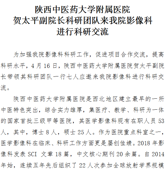 陕西中医药大学附属医院贺太平副院长科研团队来21点游戏攻略站 影像科进行科研交流