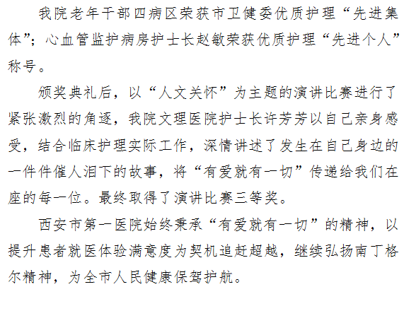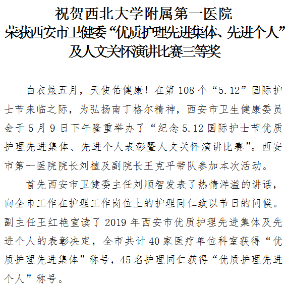 祝贺市一院荣获西安市卫健委“优质护理先进集体、先进个人”及人文关怀演讲比赛三等奖