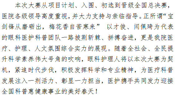 祝贺市一院眼科医护团队荣获“中华护理学会首届眼科科普演讲大赛”全国总决赛二等奖